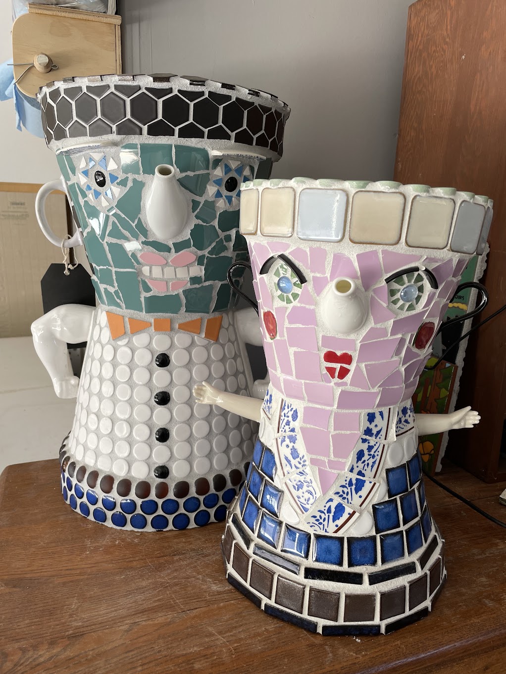 Geologic functional pottery with swirled and inlaid marbled clays.